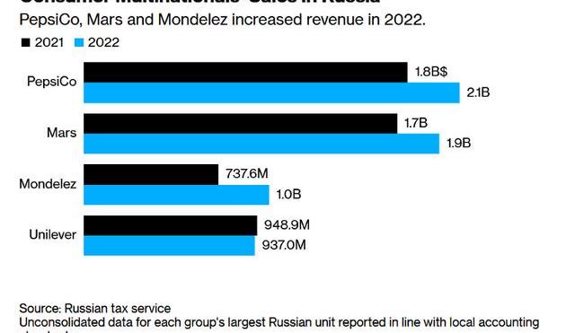 4.去年,玛氏和百事可乐在俄罗斯的销售额大幅增长,这凸显出俄罗斯消费者的强劲购买力。根据最近向俄罗斯税务机关提交的一份文件,按当地会计标准,玛氏的销售额增长了14%,达到1770亿卢布,利润增长了58%,达到270亿卢布。百事可乐在俄罗斯的收入增长了16%,利润增长了四倍。然而,这些资金存在向俄罗斯境外转移的限制。这些大型企业预计还将因2021-2022年利润与2018-2019年利润差额征收10%的暴利税。全球消费巨头表示,正在缩减在俄罗斯的业务,但这些大品牌在俄罗斯的运营实际上没有受到什么影响。可口可乐确实退出了,但其产品仍然可以通过第三国进口,市场上也出现了模仿可口可乐的俄罗斯品牌汽水以满足需求。
