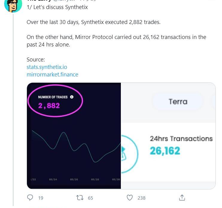 巴比特讯,推特用户“TheLarry”今日发推分析了合成资产协议Synthetix近况。在过去的三十天内,Synthetix执行了2,882笔交易。在过去七天里,Synthetix交易额是1.22亿美元。在手续费收入方面,Systemax本期产生了543,000美元收入。最值得关注的是,Synthetix在过去30天的日均交易者数量只有63人,这意味着全世界每天只有63个人在Synthetix上进行交易。TheLarry猜测,用户量数据并不完整,因为许多设计Synths的交易可能会在其他地方发生,而且这些交易都没有调用Synthetix智能合约。但无论如何,这个数字的确有点少。根据coingecko数据,Synthetix代币SNX当前流通市值10.71亿美元,排名全球加密资产71位。