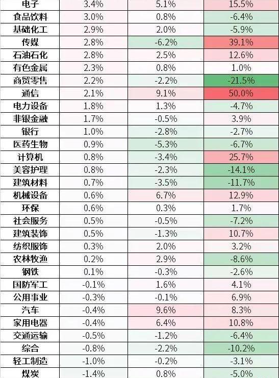 本周申万一级31个行业涨多跌少,其中电子、食品饮料、基础化工等行业涨幅领先;房地产、煤炭、轻工制造等行业跌幅居前。
