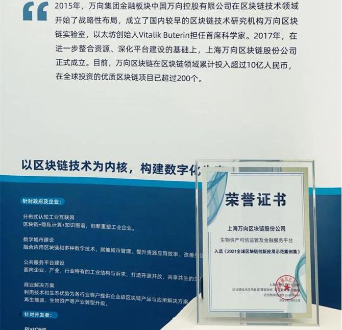 在大会上,万向区块链生物资产可信监管及金融服务平台成功入选上海金融信息行业协会联合行业研究机构发布的《2021全球区块链创新应用示范案例集》。