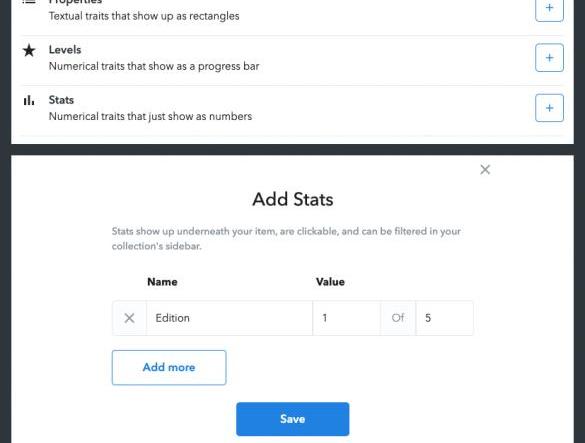 创建新项目流程的第一步目前,您一次只能创建一个NFT,因此如果您计划制作同一件作品的五个版本并希望潜在买家知道供应量,请在统计部分添加版本号,如下所示。如果您希望制作多个相同项目的副本,而不是创建更多单独的令牌并按照建议在统计信息中注明版本号,您可以在URL末尾添加?enable_supply=true页面顶部,然后按Enter重新加载。之后,应该可以编辑供应字段。重要的是要注意,例如,如果您确实将供应量调整为100,则需要设置100个单独的销售清单,并将数量设置为“1”。目前无法同时列出100个出售并让买家选择他们想要购买的数量,属性和级别使买家在浏览您的收藏时更容易过滤您的作品,因此请在相关时添加它们。属性的一个示例是“创建年份”-“2021”。