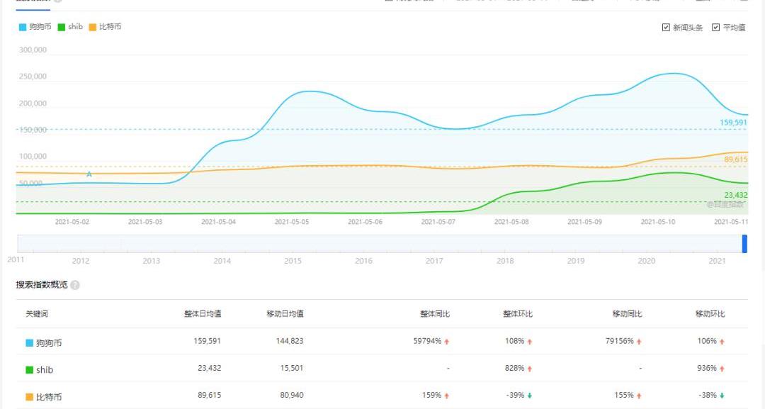 微信方面,微信指数显示,狗狗币5月11日指数突破400万,而同期比特币指数仅为225.7万。拿笔者亲身经历来说,最近就有从事短视频创作的朋友向笔者询问狗狗币相关信息。