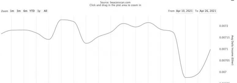 平均每日以太坊2.0验证者收入在此过程中,不会削减任何验证程序,这意味着不会因恶意行为而将用户强制从网络中删除。损害仅限于错过的验证者奖励。该事故持续了大约两个小时,错过了403个区块。从那时起,PrysmaticLabs团队已经发布了该软件的新版本,并修复了这个漏洞。在PrysmaticLabs的首席开发者RaulJordan的Discord信息中,他强调所有运行Prysm的用户都应该“立即”更新其软件。Jordan表示,“如果我们对解决方案没有最高的信心,我们既不会发布公告,也不会发布修补程序。”任何尚未升级到最新版本的Prysm验证者都有丢失网络奖励的风险。尽管该漏洞的影响在4月24日最为广泛,但最早在1月20日和最近的4月25日就以较小的规模出现。对于所有未运行Prysm客户端软件的以太坊2.0验证器,无需采取任何措施。CoinDesk的验证器在Lighthouse客户端软件上运行。结果,我们发现每日验证的操作和奖励几乎没有变化。