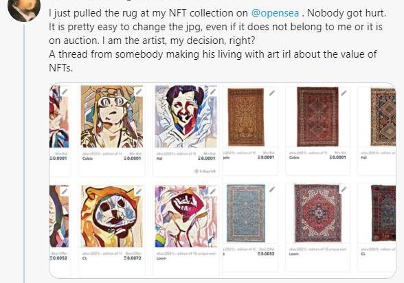 海外的一位加密艺术家、NFT用户@Neitherconfirm曾表示,进入到opensea之后,即使该JPG在拍卖状态或者该JPG本不属于他,但用户仍可以去改变这张图。
