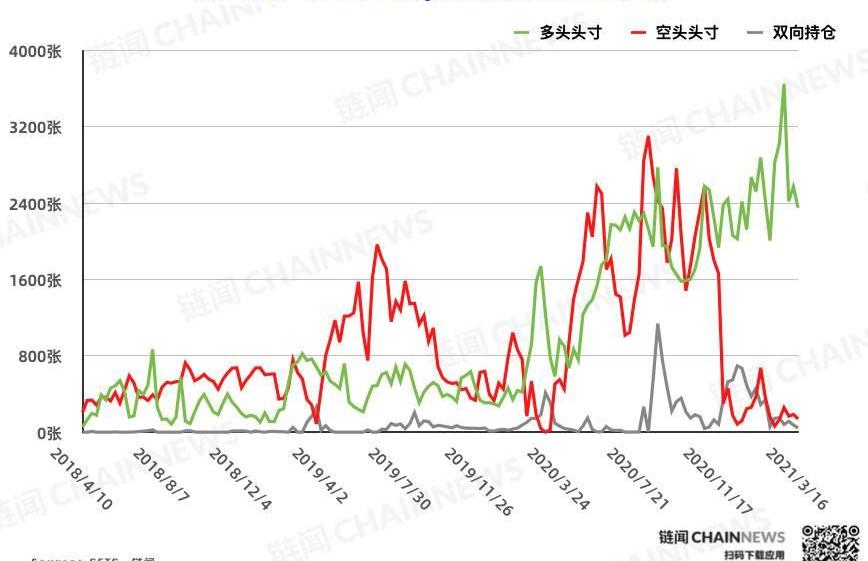 总持仓数量在最新一期数据中自8785张进一步上涨至9335张,虽然上涨幅度并不是非常可观,但是连续两周的资金入场还是显示出了行情再创历史高点背景下可观的市场热度。至少在行情创新高后出现快速回调的第一时间,暂时没有特别剧烈的恐慌情绪集中涌现。