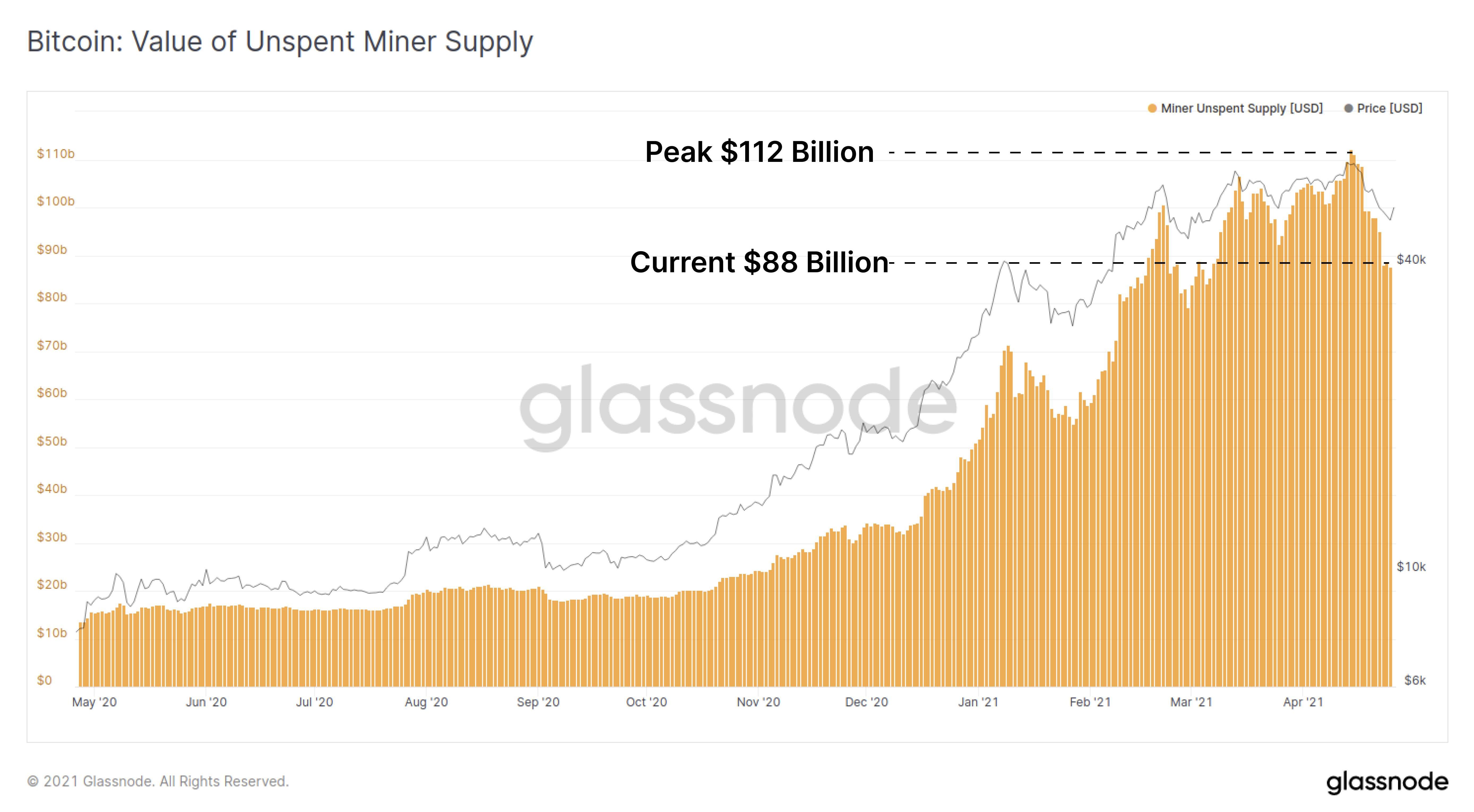以美元计算,未花费的矿工币供应在这次价格调整前达到了历史最高水平的1120亿美元,目前这些BTC的价值约为880亿美元。