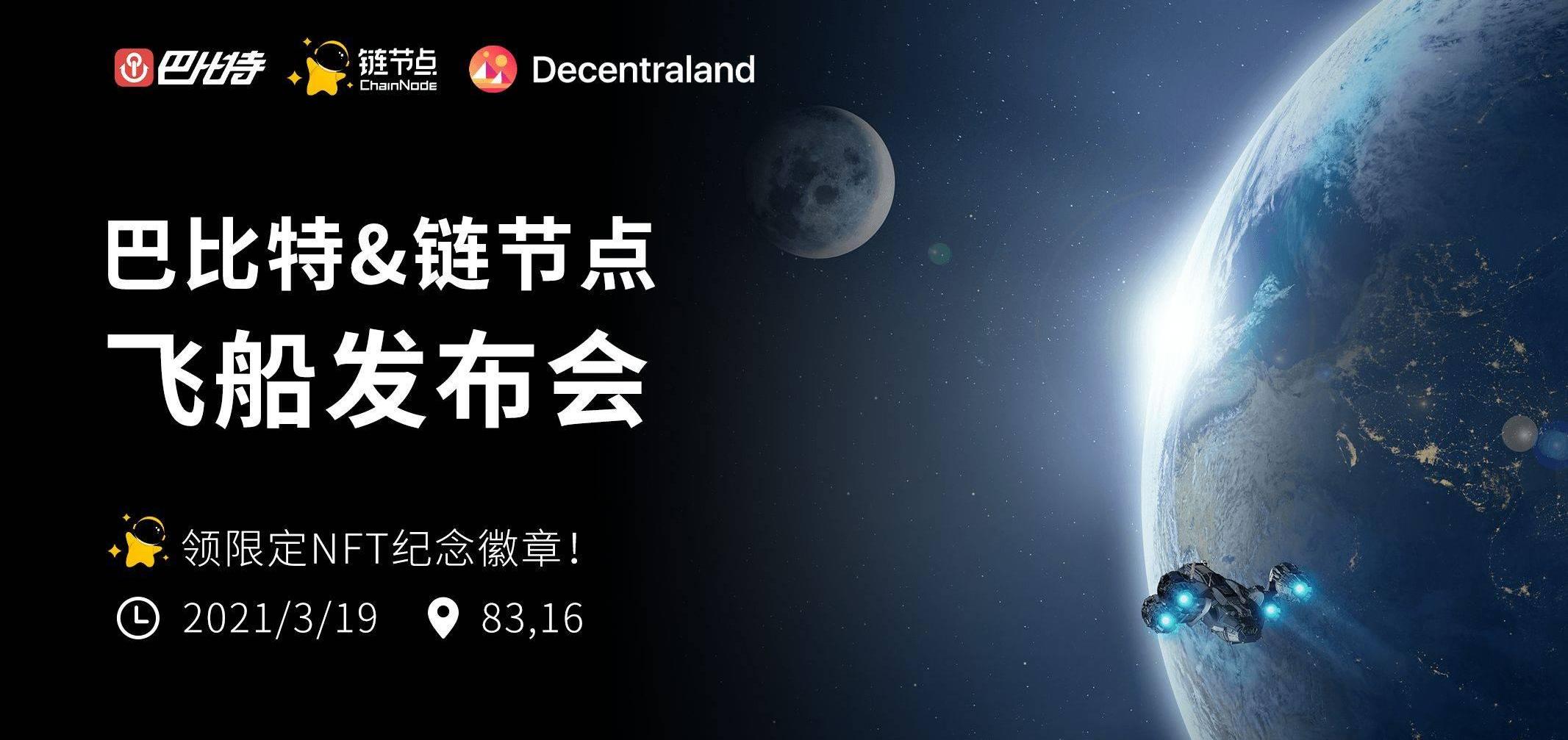 3月19日21点,巴比特携手链节点在Decentraland虚拟世界中举行飞船发布会。本次活动截止至4月19日18点,玩家进入Decentraland世界—巴比特飞船。巴比特飞船入口处即可领取“发布会NFT纪念勋章”,限量888份。在评论区晒出与巴比特飞船的合影,我们会挑选50名用户每人送出100社区金币。