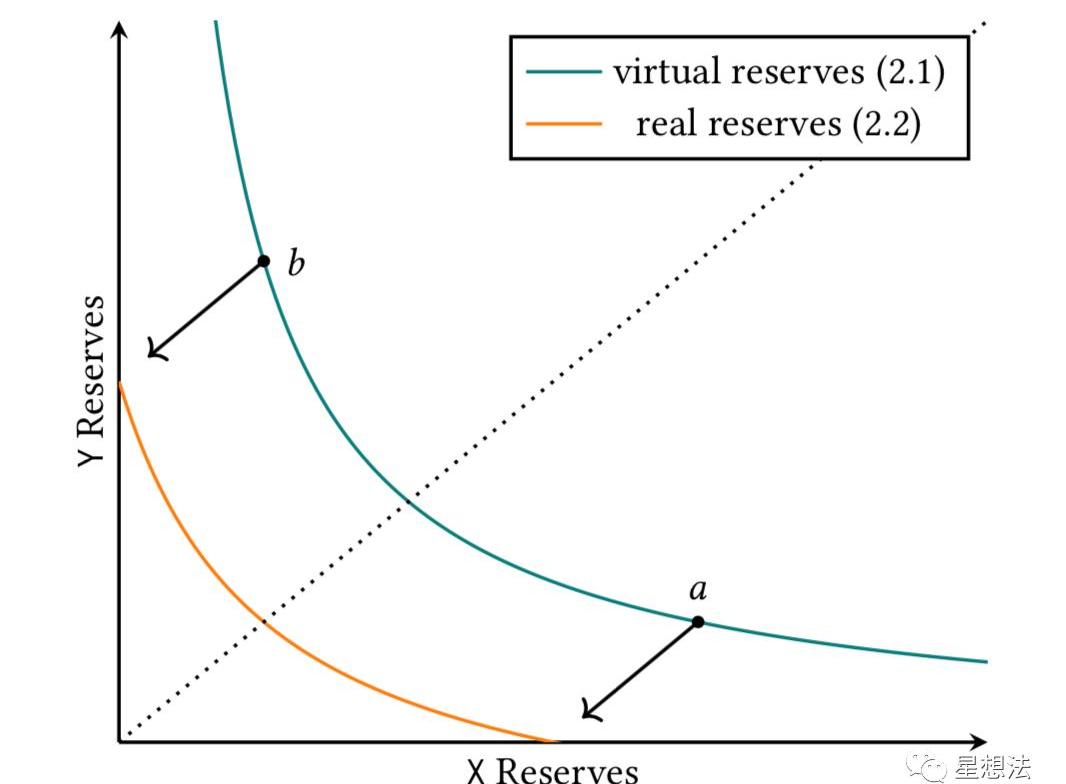 uniswap的交易采用的乘积固定模型(x*y=k)。所谓的虚拟资金池(VirtualReserves),是指还在乘积固定曲线上,只提供某个区间流动性的资金池: