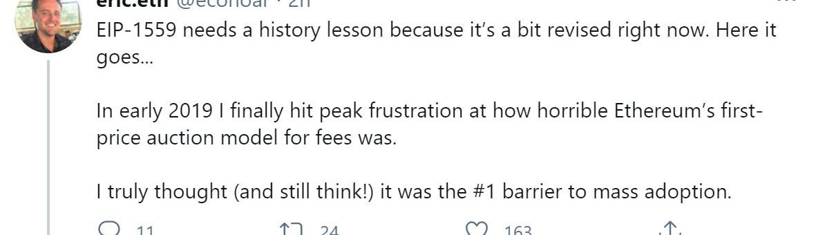 星球日报讯以太坊核心开发者eric.eth发布推特称,EIP-1559需要上一堂历史课,因为它现在有点修改了。在2019年初,其对以太坊费用的第一个价格拍卖模型非常糟糕,感到十分沮丧。eric.eth认为这是大规模采用的第一道障碍。这种挫败感纯粹是一种用户体验。这与销毁费用的想法无关。在缺乏回应和理解了V神的论文后,我明白了那是最好的选择,并联系了V神。然后我们一起写了EIP-1559。值得注意的是,销毁基本费只是论文和medium文章中的一个技术性的旁注。其重点纯粹在于改善用户体验和解决Gas市场的低效问题。然而,目前EIP-1559整体叙述变成了“因为它销毁ETH,所以是好的”,这有点令人沮丧。这是一个很好的副作用,但这不是我们应该实施它的原因。我们可能会销毁一些ETH,但人们对齐过分期待。不是每一笔费用的所有部分都会被销毁,一旦有了规模,销毁的费用会更少。此前消息,EIP-1559预计今年推出。据悉,EIP-1559试图通过引入固定费用和销毁机制来降低交易费用。EIP-1559由V神于2018年首次提出,预计使以太坊区块链的收费市场更加可预测并缓解拥堵。