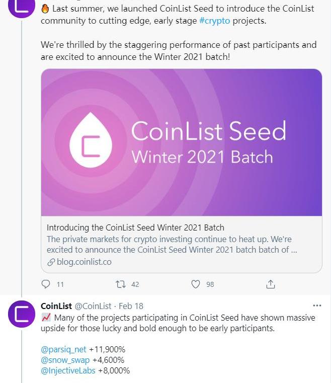 CoinList近日公布CoinListSeed2021年冬季的第三批公司名单,包括BabylonFinance、BosonProtocol、Clover、DePay、Showcase、Titan和VirtuePoker。据悉,去年夏天,CoinList推出CoinListSeed,重点是向CoinList社区介绍高质量的早期投资机会。前两批CoinListSeed中启动的项目表现亮眼,PARSIQ上涨11900%,InjectiveProtocol上涨8000%,SnowSwap上涨4600%。