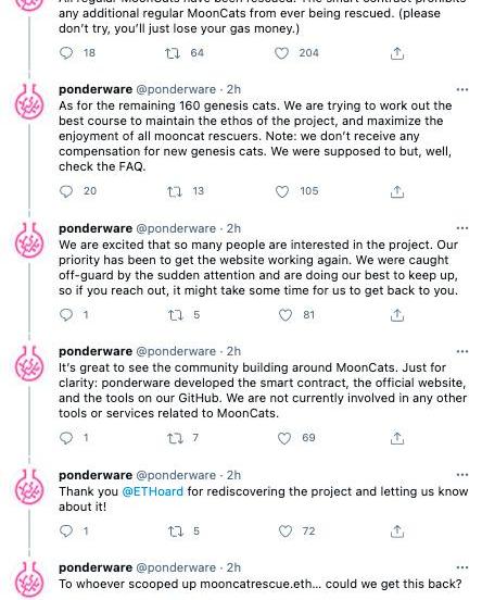根据MoonCatRescue网站,这个项目是由两人组成的团队Ponderware开发,其推特账户和网站一样自2017年以来几乎没有更新。在每一只MoonCat获救后,Ponderware用一条推文打破他们四年的沉默,“试图与Moonbase重新建立联系。敬请关注。”Ponderware之后更新称,“正与收养中心重新建立联系。”
