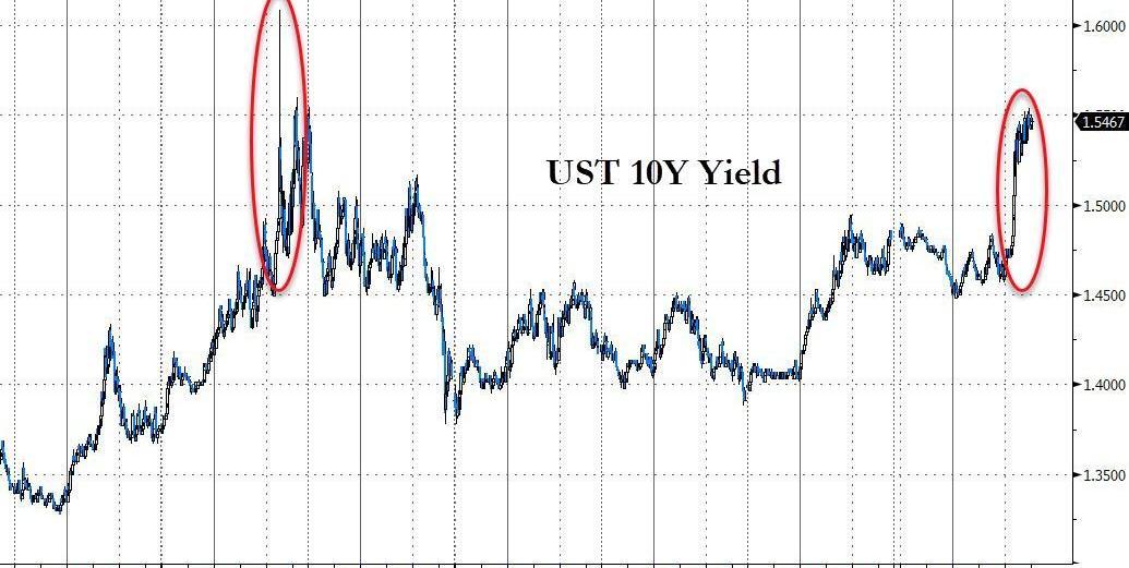 美国10年期基准国债收益率在鲍威尔讲话期间短线拉升逾8个基点,站上1.50%,在他讲话结束后一度升破1.55%,较日内低位升约10个基点,到美股收盘时约为1.54%,日内升6个基点,重现一周前的升势,美股盘后又突破1.56%,向上周四升破1.6%所创的一年来高位迈进。