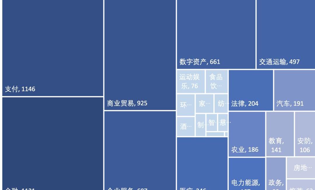 从专利涉及的行业和应用场景来看,我国申请的区块链专利覆盖支付、金融、商业贸易、企业服务、数字资产、交通运输等27个行业。其中申请支付、金融相关专利的公司超过1000家;申请商业贸易、企业服务和数字资产的公司在500-1000家之间。