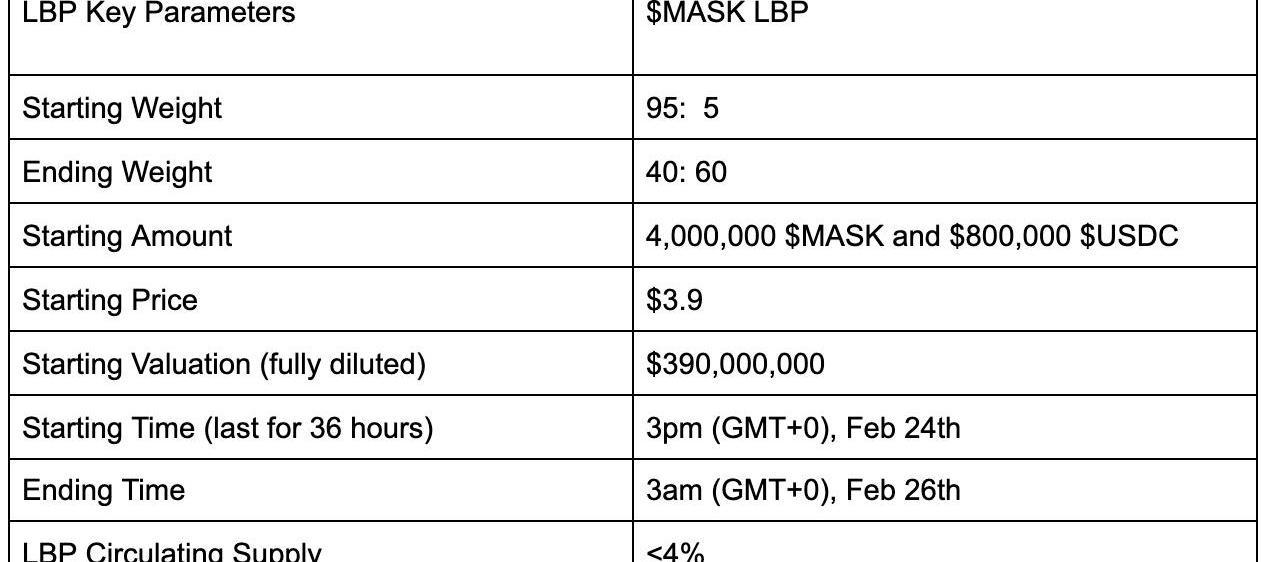 在LBP开始时,我们将投入400万枚MASK和80万枚USDC,起始价3.9美元/枚。详情请看下表: