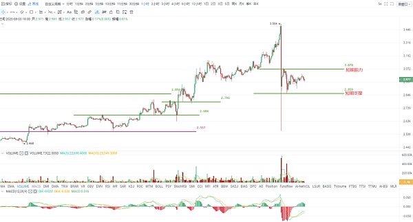 对于接下来的走势没有太多可说的,也大概率跟这BTC的节奏走,短期由于下跌惯性很难快速止跌大反弹,同时由于跌幅巨大,继续大幅下跌的概率也不大,那么短期关注2.85-3.07盘整区即可。如果BTC、ETH这种偏强势币种反弹到阻力位出现受阻现象,可以考虑来做空EOS。