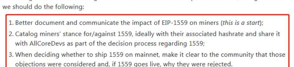 3.在决定是否主网上线1559时,需向社区表明已考虑过反对意见,而如果1559仍旧上线,会解释拒绝的原因。”