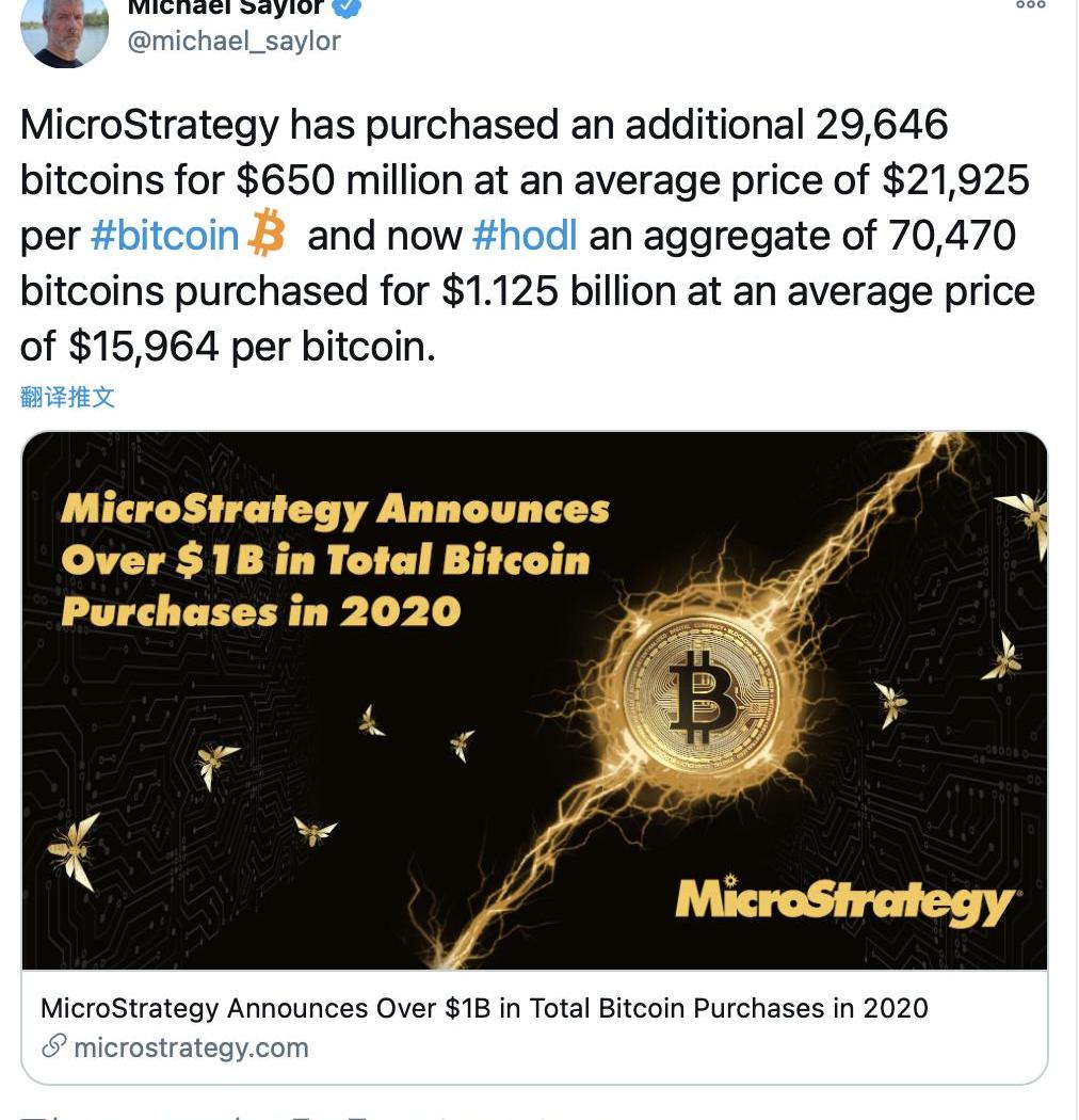 全球最大的独立BI公司微策略周一表示,该公司又购买了29,646个比特币,价值约6.5亿美元,使其今年的比特币购买总额超过了10亿美元,达到11.25亿美元。