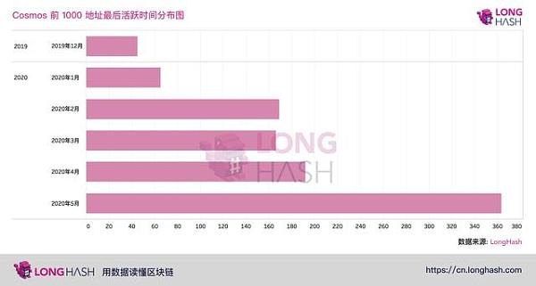 Cosmos Hub 于 2019 年 3 月 13 日上线主网,在 Cosmos 中,有 44.25% 的地址目前处于活跃状态,也就是在过去的一个月内发生过交易,这些地址在 2020 年,也就是 1-5 个月中发生过交易的比例达到了 95.5 %。从对比中可以看出,Tezos 和 Cosmos 的持币地址整体活跃度都比较高,Tezos 地址最后活跃在 2020 年 5 月的比例更高,有 60% 以上的地址在过去一个月内保持着活跃的状态。