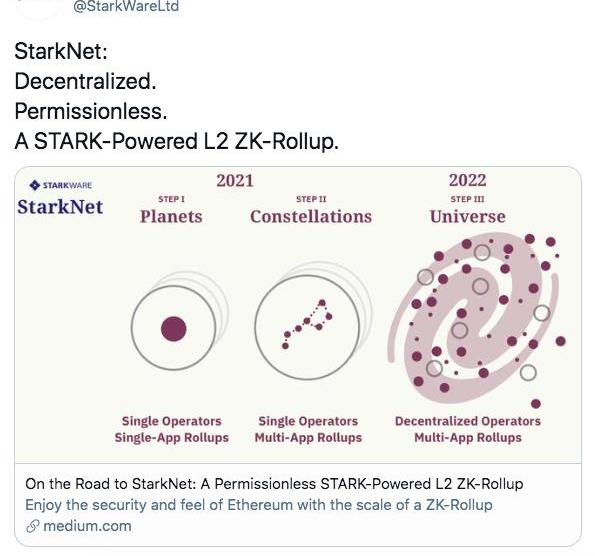 零知识证明研发机构StarkWare表示,其二层扩容解决方案ZKRollup“StarkNet”目前已经完成基础构建,即图灵完备框架Cairo、STARK软件堆栈和二层扩容引擎StarkEx,之后将进行构建阶段一至阶段三。其中,阶段一将支持单一应用Rollup“Single-AppRollup”,将使开发人员能够在StarkNet上构建和部署自己的可扩展性应用程序;阶段二将支持多应用Rollup“Multi-AppRollup”,支持在同一StarkNet实例上运行并访问多个应用程序,这将实现不同应用程序之间的互操作性,以及降低Gas成本;阶段三将支持去中心化Rollup“DecentralizedRollup”。StarkWare预计将在近几个月内部署阶段一,并在2021年底之前顺利进入阶段二和阶段三。StarkWare构建的StarkNet是一种由STARK驱动的去中心化二层ZKRollup,可支持以太坊的通用计算。