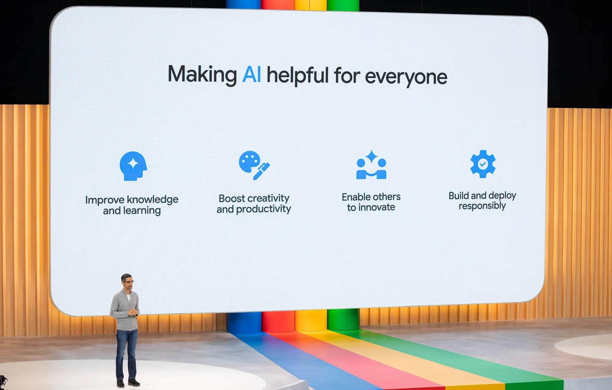 谷歌首席执行官桑达尔·皮查伊(SundarPichai)在2023年I/O开发者大会上。