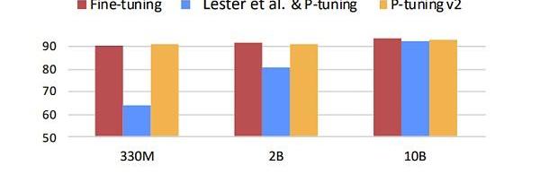 问题来了,这么少的参数真的能逼近?finetuning的效果吗,当然还是有一定的局限性。如下图所示,蓝色部分代表初版的prompttuning,可以发现prompttuning仅有在模型参数量级达到一定程度是才有效果。虽然这可以解决大多数的场景,但在某些具体垂直领域的应用场景下则未必有用。因为垂直领域的微调往往不需要综合的LLM预训练模型,仅需垂直领域的LLM模型即可,但是相对的,模型参数不会那么大。所以随着发展,改版后的prompttuning效果可以完全取代fine-tuning。下图中的黄色部分展示的就是prompttuningv2也就是第二版本的prompttuning的效果。