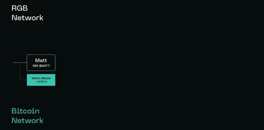 他会在?RGB?网络上给自己发行?100?个新的$MATT?代币。然后,这些$MATT?代币的状态将分配给?MATT?拥有的原生比特币?UTXO。