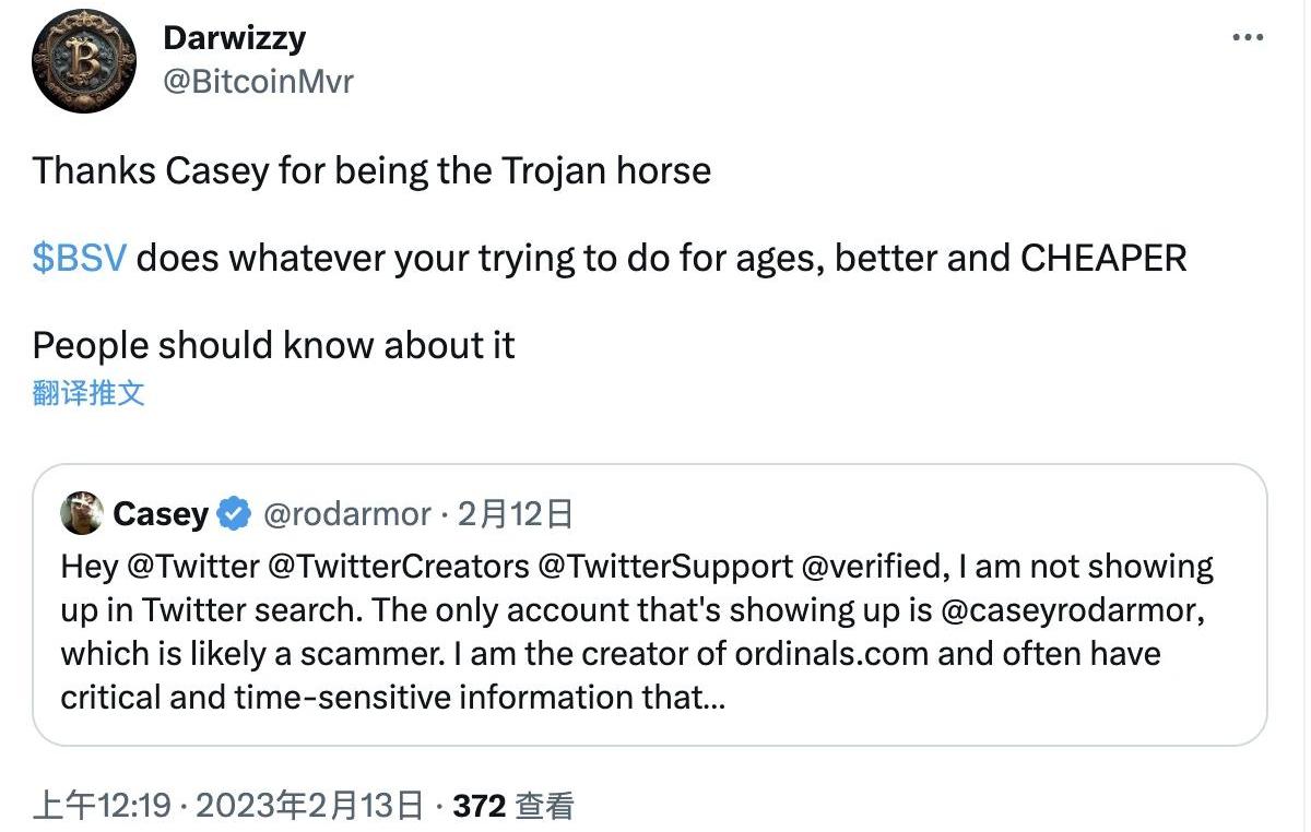 在不少BSV爱好者看来,无论是BTCNFT还是Ordinals都是之前BSV社区一直倡导做的一些事情,并在推特上感谢Casey成为特洛伊木马。