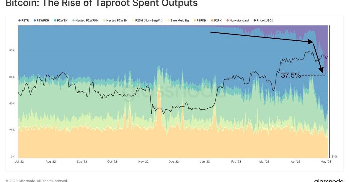 通过观察比特币网络中支出的类型,就会发现是?Taproot?交易有所增加,在?4?月?30?日,?37.5%?的支出是?P?2?TR?类型。