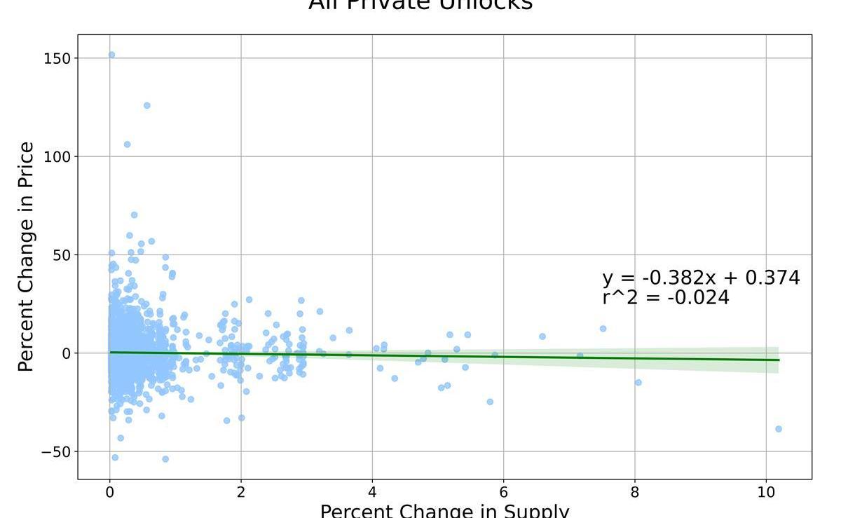 一个值得注意的特征是供应量解锁的0%和1%之间的点簇,表明在不同的解锁规模范围内可能存在不同的关系。为了调查这一点,我们分别观察解锁量在0?%至1?%和大于1?%之间的情况。