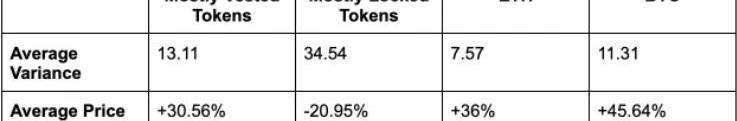 这两个组的行为差异很大。大部分已解锁的代币更加接近ETH和BTC,意味着它们基本上会按照市场的走势而运动。然而,在大部分还未解锁的代币中,我们看到它们在同一时间段内价格有相当大的下降,并且方差比大部分已解锁的代币高2.6倍。显然,已经解锁了大部分代币的代币比仍在解锁代币的代币要稳定得多,并且价值上升得更多。这证实了我们的假设:一旦大部分代币解锁,代币的价格就变得更加稳定。我们认为这是因为代币已经转移到了那些对协议有更长期信仰的社区和投资者手中。