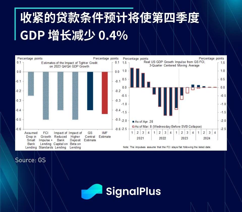 FOMC可能会在5月的会议上加息25个基点至5.25%?,这符合市场普遍的预期,市场的焦点将放在美联储如何调整声明中的前瞻性指引,市场预期美联储将暗示6月会暂停加息,同时试图用更鹰派的言辞来抵消政策转向的影响,预计美联储会以近期银行业压力和信贷条件收紧作为支持6月暂停加息的主要理由,加上经济也可能在今年下半年陷入温和衰退。从数字上来看,华尔街预计信贷条件收紧将对第四季度GDP造成-0.4%的影响,效果相当于约1.5次加息。与往常一样,问答环节将是解读Powell信息中细微差别的关键,不过这次会议很大一部分时间可能会被债务上限问题的讨论所占据。