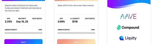 zk.money已集成部分DeFi协议,包括流动性质押协议Lido和固定利率协议ElementFinance。扩展的zk.money功能,支持默认情况下具有隐私保护的DeFi交互,使用Curve购买Lido流动质押Ether并进入ElementFinance的固定利率储藏室。