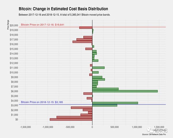 尽管在这个图表中不容易看到,但随着价格继续下降,见证了随后的逢低买入者的卖出。出现了大宗的交易 --挖出的1370万个比特币中有570万个比特币从在不同的价格间买进卖出。使用这个市场周期作为对根深蒂固的投资者心理的研究,直到出现投资者投降式抛售的情形价格才会见底,这些投资者包括在高点买入的人,很多的早期参与者以及代表最具信仰投资者但也随着价格继续下跌达到最痛苦阶段的早期逢低买入者。