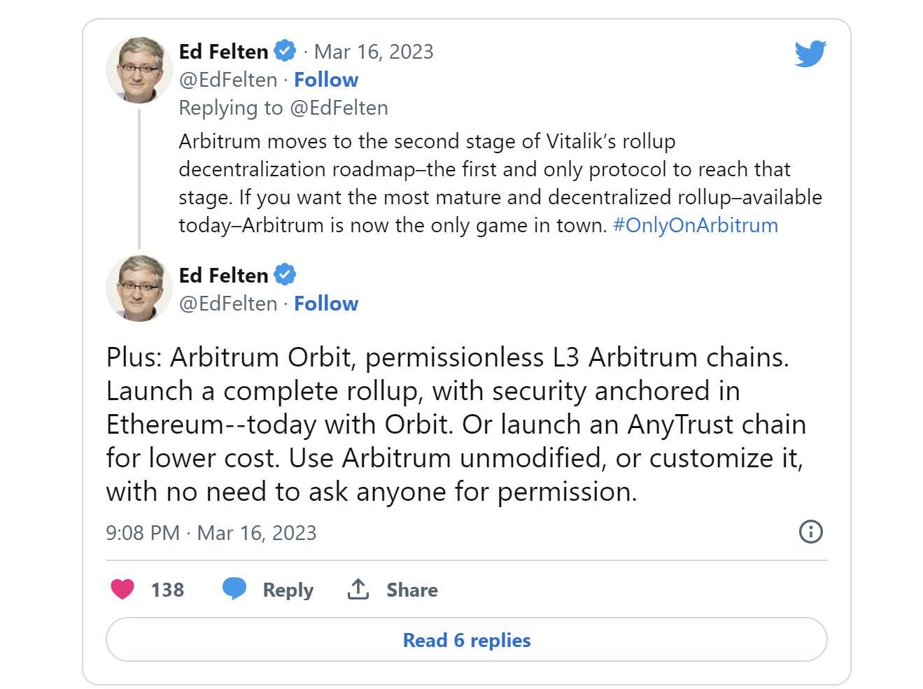 上周,除了宣布空投计划外,Arbitrum还宣布了Orbit——一种开发者解决方案,在其中可以将L3s作为完整的Rollups或AnyTrust实例启动。与Stylus配对使用,Orbit允许开发人员构建C、C++和Rust等语言编写的应用程序,以及像Solidity这样的EVM语言。OffchainLabs设想利用L3s进行快速实验:引入新治理机制、修改Nitro等无需权限即可滚动升级。
