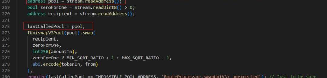 4.在这里可以看到,pool的值是由stream解析而来,而stream参数是用户所能控制的,这是漏洞的关键原因,这里lastCalledPool的值当然也是被一并操控的,接着就进入到攻击者指定的恶意pool地址的swap函数中去进行相关处理了。