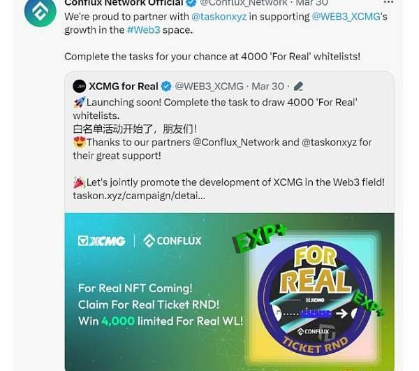 不止互联网企业,中国很多传统企业在发展中也在进行Web3相关的探索。受到政府扶持的CONFLUX积极布局,与传统产业龙头徐工集团联手进军国际Web3。不同于PFP以及传统品牌进入WEB3的模式,徐工集团表示将以“硬核机械”的重机文化为内核,鼓励扶持创作者社区及青年艺术家,构建创作性IP文化空间。他们也通过Web3任务平台TaskOn发起了特有的限量NFT白名单活动。