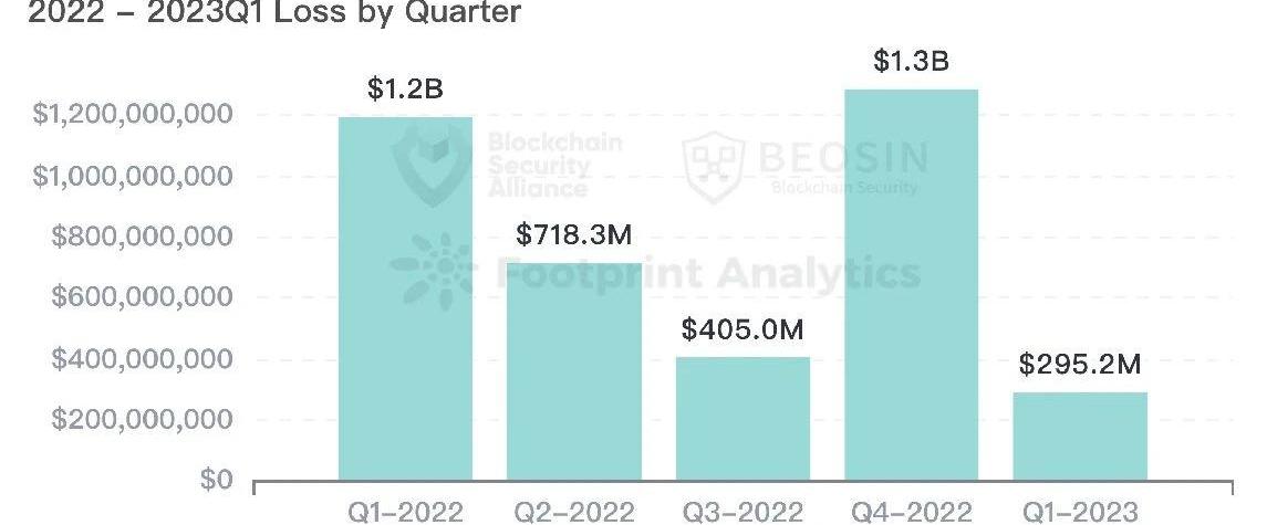 2023?年第一季度,据区块链安全审计公司?Beosin?旗下?BeosinEagleEye?安全风险监控、预警与阻断平台共监测到Web3领域主要攻击事件?61?起,总损失金额约为?2.95?亿美元,较?2022?年第?4?季度下降了约?77%?。2023?年第一季度的总损失金额低于?2022?年的任何一个季度。
