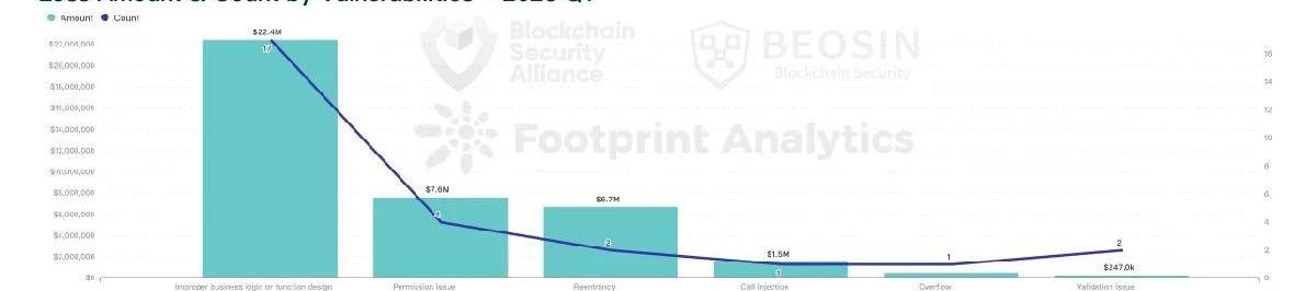 按照漏洞类型细分,造成损失最多的前三名分别是业务逻辑/函数设计不当、权限问题和重入。17?次业务逻辑/函数设计不当漏洞共造成了?2244?万美元的损失。