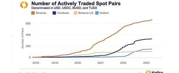 从更普遍的意义上讲,Binance与美国交易所相比的另一个优势是它可以自由上市新的代币进行现货交易。截至目前,Binance的活跃交易对是Coinbase的两倍以上,是Kraken的四倍,是Binance.US的六倍。