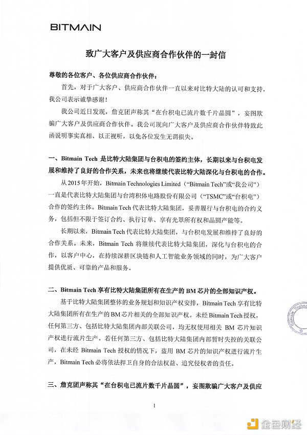 7月23日,公众号蚂蚁售前发布盖有吴忌寒印章公告(致广大客户及供应商合作伙伴的一封信)。公告称,我司近日发现,詹克团声称其在台积电已流片数千片晶圆,妄图广大客户及供应商合作伙伴。我公司现向广大客户及供应商合作伙伴特致此函说明事实真相、以正视听,以免各位发生无谓损失。公告还称,另需说明的是,自2019年11月15日起,詹克团亦已被免除于福建湛华智能科技有限公司所担任的职务,目前詹克团亦无权福建湛华实施任何行为、与诸位达成任何交易,其假借福建湛华名义实施的行为,亦属其个人行为,请各位知悉。