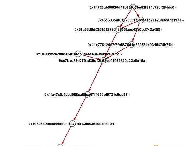 主要是通过图挖掘算法、在资金网络中找到星型、链式、树状等结构的团伙,分析所在团伙的行为模式。如下图?2?张图所示,每个红点表示游戏钱包地址,黑色的边表示两个红点有过资金往来,黑色箭头的方向表示资金的传递方向,由点、边的关系就形成了资金网络团伙。下面会对部分团伙的资金形成及行为模式进行分析。