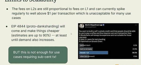 MartinK?ppelmann?认为L2峰值Gas太高了,有时会到$1以上,即使EIP4844落实,Gas能降低90%,但依旧有两方面问题:它对于需要Gas在1美分以下的场景依旧不适用;需求增加后Gas依旧会升高。