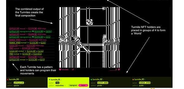 Straylight是一款协作式链上Etch-a-Sketch游戏,玩家可以在游戏中铸造带有移动技能的TurmiteNFT。Turmite可以通过移动创建约60k图案。Straylight?Worlds包含4个Turmite,最多可以有4名玩家通过移动它们创建出不同图案。