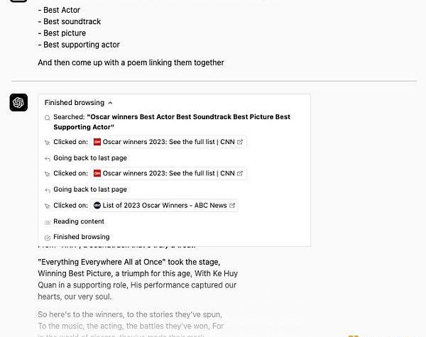 这是向ChatGPT用户开放浏览体验的一个例子,以前会让模型礼貌地指出它的训练数据没有包含足够的信息来让它回答。在这个示例中,ChatGPT检索有关最新奥斯卡颁奖典礼的最新信息,然后执行现在熟悉的ChatGPT操作,这是浏览可以成为一种附加体验的一种方式。