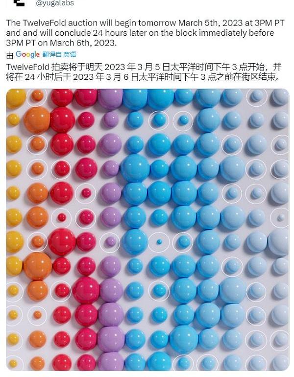3月5日消息,NFT领域知名的“无聊猿”IP背后团队YugaLabs在社交媒体上发文表示,TwelveFold拍卖将于太平洋时间3月5日下午3点开始,并将在24小时后的太平洋时间2023年3月6日下午3点之前结束。