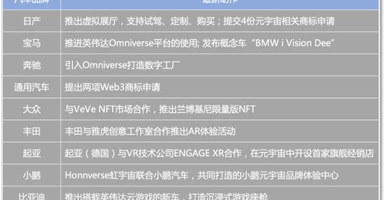 诸多行动都释放了日产积极布局元宇宙的信号,但它不是今年唯一在元宇宙上选择继续布局的车企。《元宇宙日爆》梳理了近三个月来颇具代表性的案例:通用汽车申请注册元宇宙相关商标,宝马、奔驰、起亚、比亚迪等国内外头部车企也推出了虚拟展厅、智能座舱等多个落地场景。