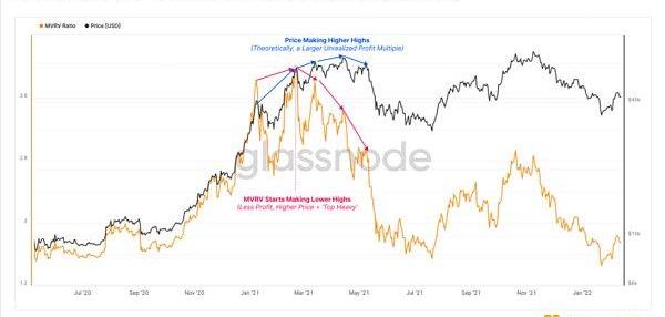 如果我们放大2021年1月至5月的峰值,我们实际上可以看到MVRV比率在较小范围内形成了类似的负背离。价格连续创下新高,但MVRV迅速下跌至较低的高点。