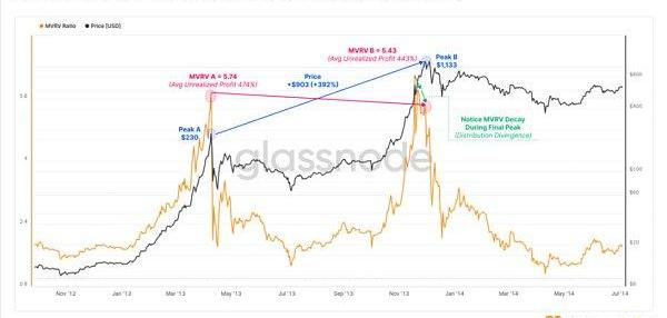 我们可以看到2013年发生在两个峰值之间的类似事件,价格上涨了392%,但MVRV比率实际上更低,从5.74下降到5.43。我们可以在下图绿色标记中看到,在最终峰值1,133美元之前发生了类似的衰减。