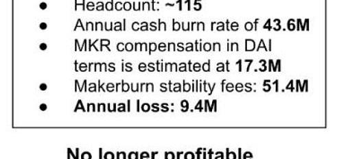 MakerDAO的创始人RuneChristensen指出在熊市中,MakerDAO的借贷收入和清算收入大幅下降,而整个协议需要大约115人的团队来维护,团队支出加上MKR的补偿使得整个协议处在亏损状态且没有增长点。此外,MKR的赋能有限。MKR从21年5月后价格一路阴跌,MKR持有者无法清楚地了解MakerDAO创造的收入具体是如何被耗尽的。