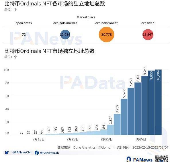 2?)ordinals.market、ORDSWAP、OrdinalsWallet?和?OpenOrdex?四大市场在?2?月?15?日至?3?月?7?日期间的累计交易总额约为?699?万美元,当前总独立地址数突破?1?万个。